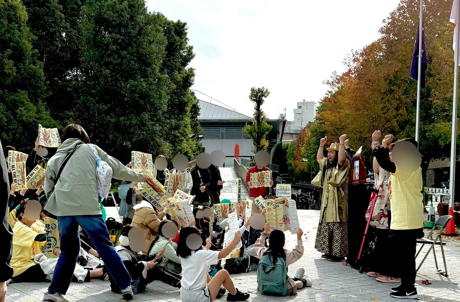 東京体育館前でデフスポーツ紙芝居を披露することができました。